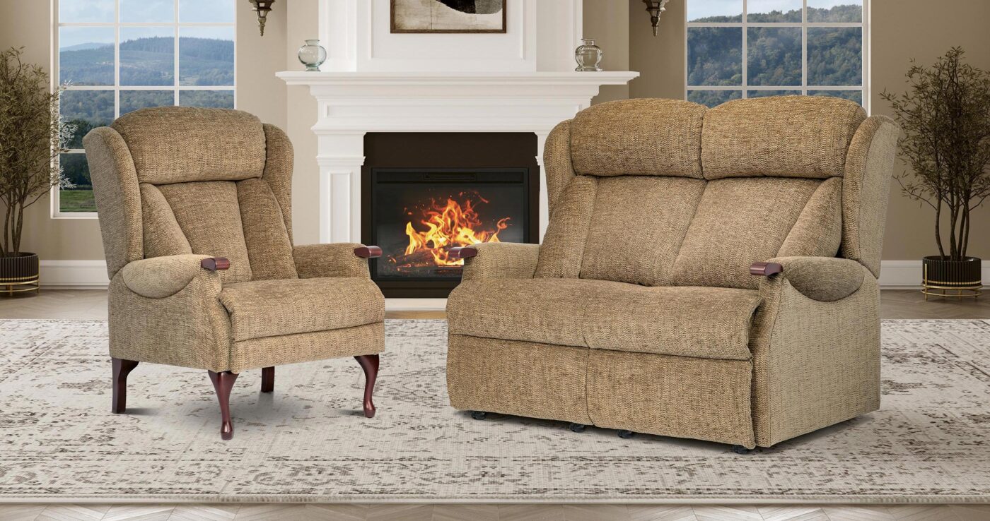 Exceptionally comfortable Fireside Chair range offered in three seat heights, with a choice of Queen Anne, Round or Classic (square) legs in a Dark or Light finish. The ergonomic, high back design features two lateral support cushions for a beautifully snug fit and a distinctive headroll. Choice of Light Oak or Dark Beech knuckles. Also matches Cartmel Knuckle Riser Recliner and Suite ranges.
