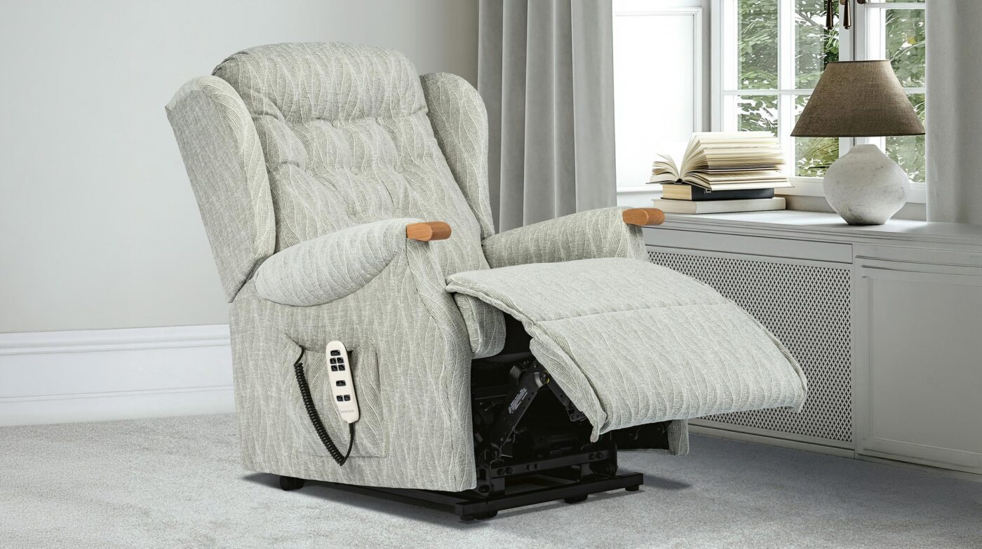 Four sizes of Riser Recliner with comfortable, supportive backs and Dark Beech or Light Oak knuckles. Optional Lumbar Adjustment for even more comfort. Can be matched with Chairs, Recliners and Settees in the Standard Lynton range with attractive scroll arms. With a huge range of fabrics to choose from.
